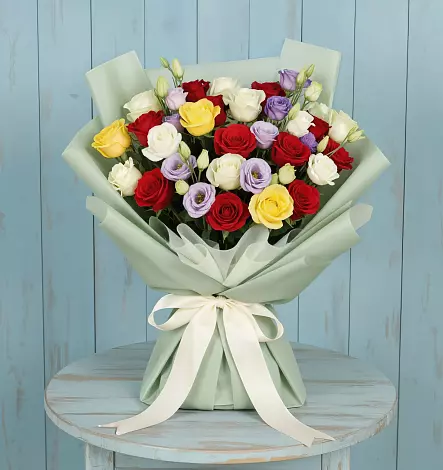 Стильный, модный, современный и яркий - все эти эпитеты именно про этот букет. Его по достоинству оценит уверенная, красивая, модная, стильная особа. Получив такой подарок, девушка не только будет в восторге, но и безусловно оценит ваш вкус, ведь если вы выбираете такой букет, то вкус у вас определенно есть. Букет сочетает в себе энергичность красного, нежность и надежность фиолетового, а так же радость желтого, благодаря чему заставит сиять от радости любую девушку. Остановите свой выбор на этом букете, если хотите поднять настроение и зарядить бодростью на целый день.